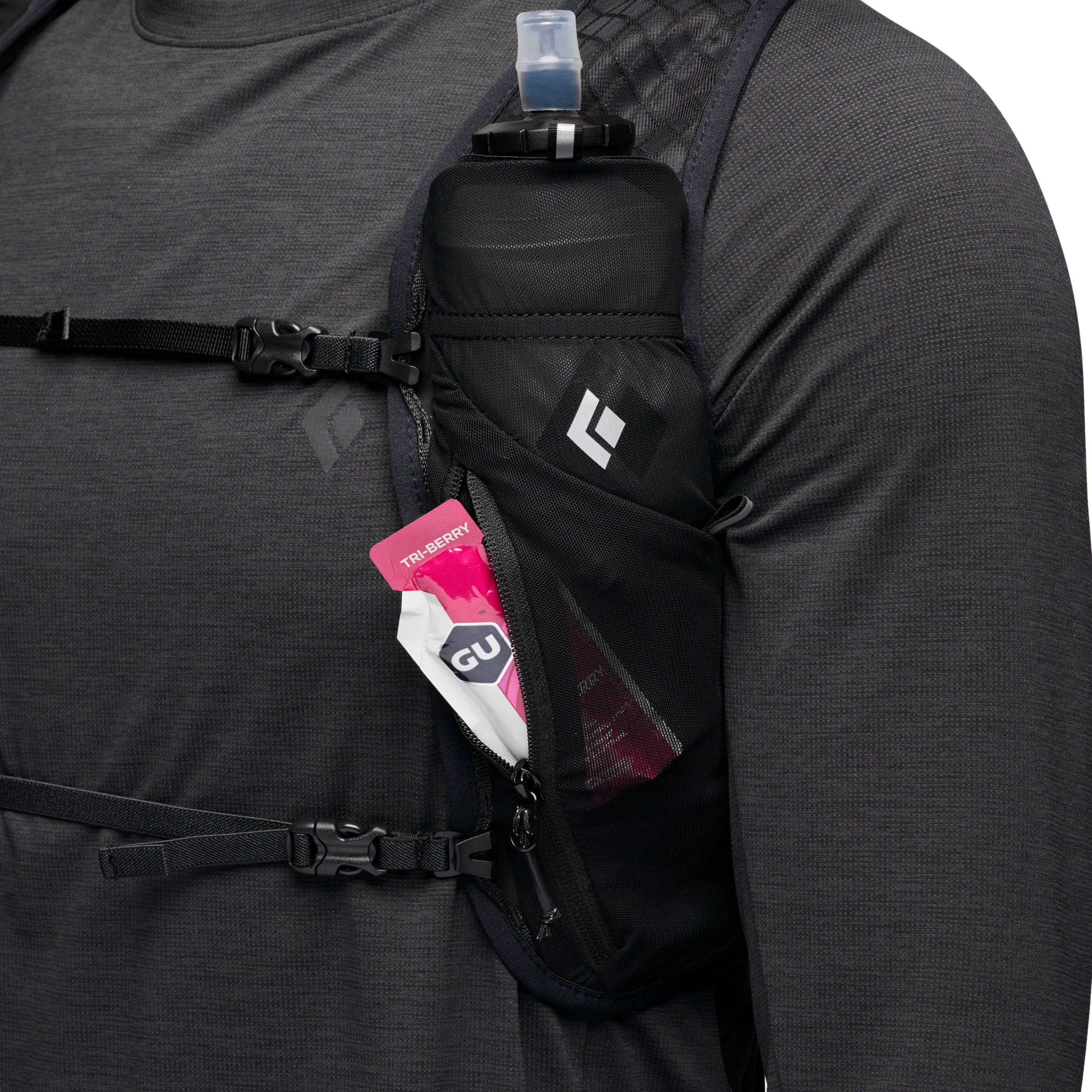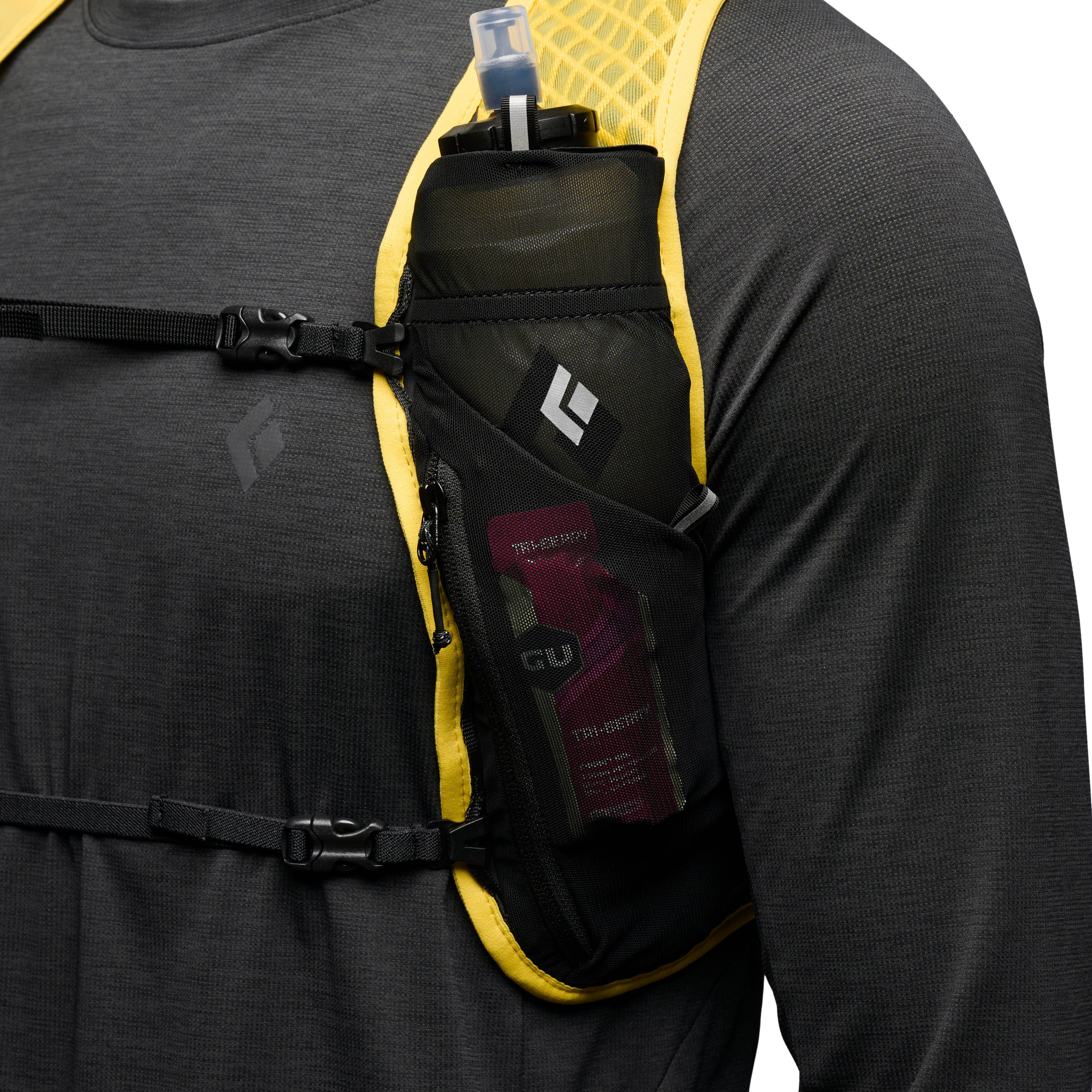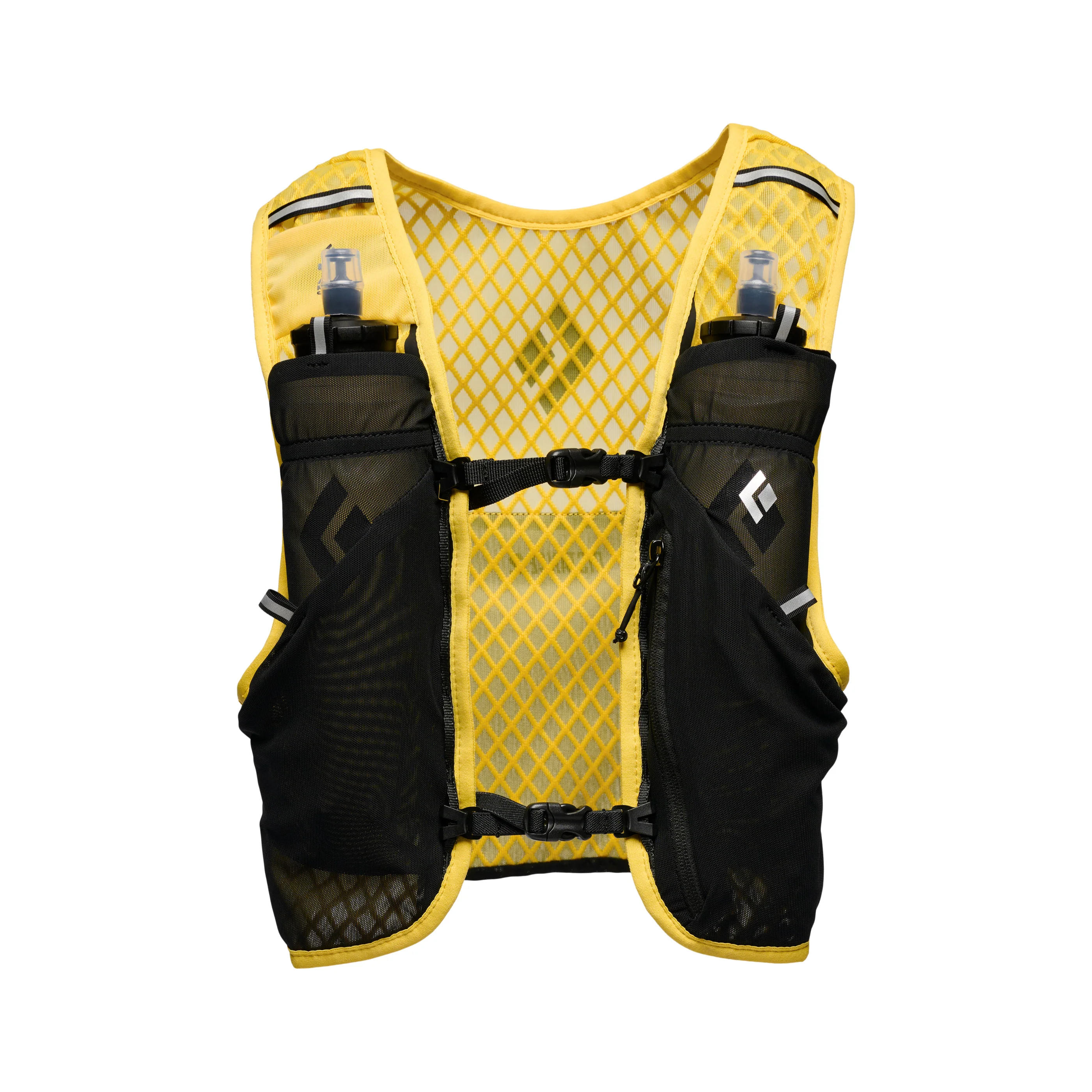 With soft edge binding and stretch mesh construction the Distance 2L has a soft next-to-skin feel. The custom engineered diamond spacer mesh back panel is extremely breathable and made from a soft material that eliminates chafe. Thoughtful pocketing and innovative soft flask storage system provides security for on-trail essentials and improves efficiency when refilling water. The vest has two front pockets that fit two 500 mL soft flasks—which are included. A rear lumbar pocket stores larger gear and a single zip front pocket holds important items and comes with a key leash.