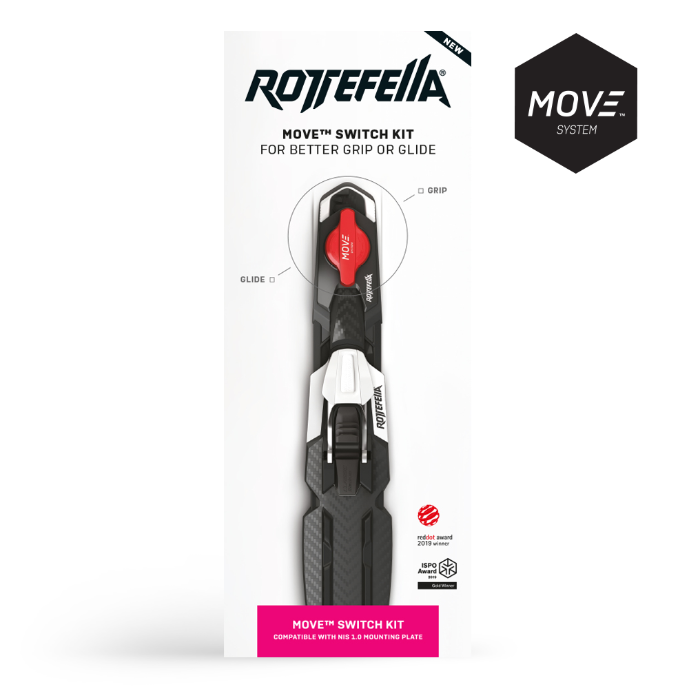 Rottefella Move Switch KIT for NIS 1.0 provides you with better grip and glide by turning the MOVE switch. Move the bindings without taking off your skis - just switch! With a bit of practice, you can even do this at speed. Move the binding forward for increased grip and backward for better glide. Perfect for wax skis and perfect for skin skis. Rottefella MOVE™ Switch is approved by FIS and can be used in all competitions. Rottefella MOVE Switch Kit for NIS 1.0 fits all skis with NIS 1.0 mounting plate. NB! The surface of some older ski models has a 3D profile. Unless the area in front of the mounting plate is flat, Rottefella MOVE™ cannot be used. Rottefella will unfortunately not be able to support the use of Rottefella MOVE™ mounted on uneven surfaces, as the adhesive plate will not attach properly.